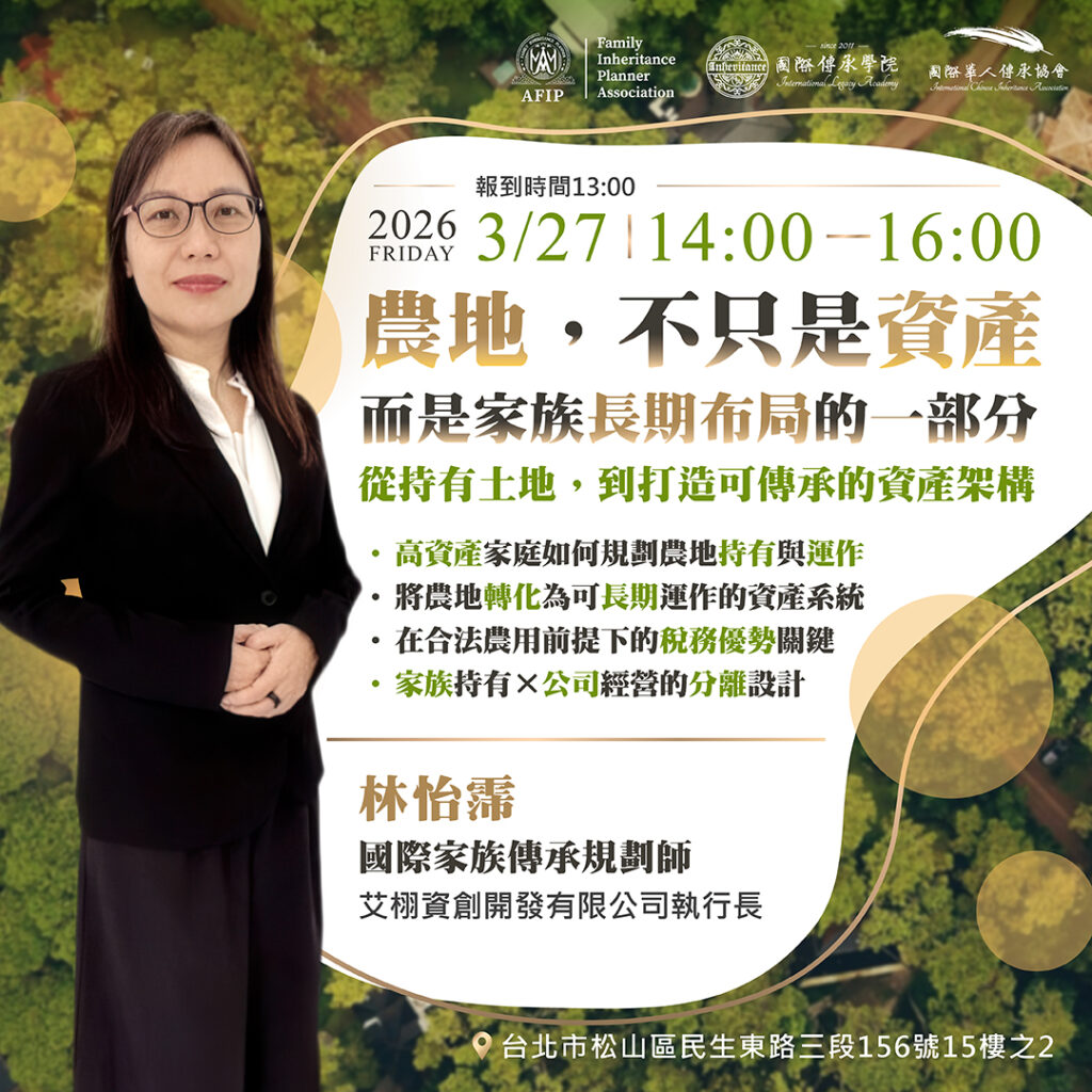 實體活動|3/27台北場|農地,不只是資產,而是家族長期布局的一部分 Posted on 2026 年 3 月 18 日2026 年 3 月 18 日 by icia-tw 18 3 月 ⎯ 講座大綱 ⎯ 1 高資產家族如何規劃農地持有與運作 2 將農地轉化爲可長期運作的資產系統 3 在合法農用在前提下的稅務優勢關鍵 4 家族持有x公司經營的分離設計 ⎯ 講座資訊 ⎯ 【日期】3/27(三) 【時間】14:00-16:00(13:30開放入場) 【地點】台北市松山區民生東路三段156號15樓之2 ⎯ 報名表 ⎯ 中文姓名 E-MAIL 您的電話 服務單位/職銜 LINE ID 送出 icia-tw |3/25台北場|個人海外所得課稅議題