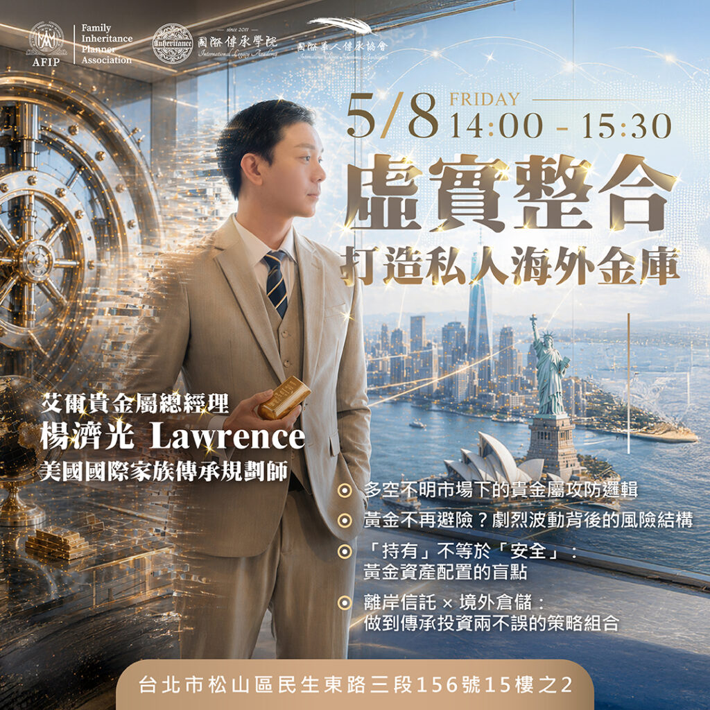 實體活動|5/8台北場|虛實整合_打造私人海外金庫 Posted on 2026 年 4 月 27 日2026 年 4 月 27 日 by icia-tw 27 4 月⎯ 講座大綱 ⎯多空不明市場下的貴金屬攻防邏輯黃金不再避險?劇烈波動背後的風險結構「持有」不等於安全;黃金資產配置的盲點離岸信託 x 境外倉儲:做到傳承投資兩不誤的策略組合⎯ 講座資訊 ⎯【日期】5/8(五)【時間】14:00-15:30(13:30開放入場)【地點】台北市松山區民生東路三段156號15樓之2 您的中文姓名 E-mail 聯絡電話 服務單位/職銜 提交 icia-tw |4/22台北場|4/29台中場|當全球局勢動盪過去可行的標的是否還可在佈局?
